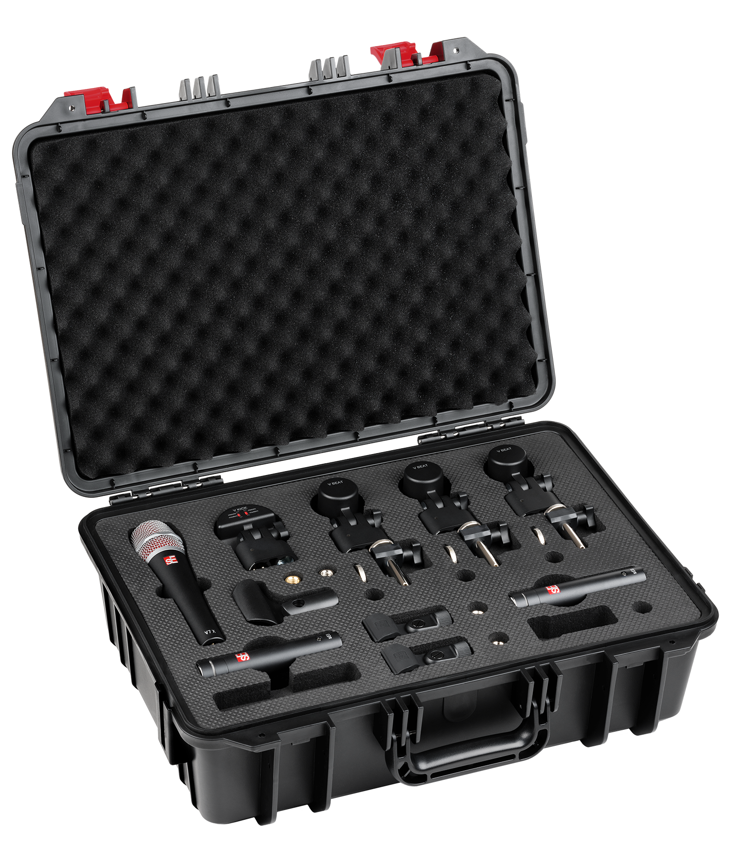 The sE Electronics V PACK ARENA is a complete microphone bundle built for drummers who take their sound seriously.  The anchor of the kit is the V KICK, featuring four switchable voicing options so you can shape your kick tone from vintage thump to contemporary punch without reaching for an EQ. The three included V BEAT tom/snare mics offer the same nuanced response as the V7 X, but in a compact, drum-friendly form that stays out of your way and locks into place quickly thanks to the V Clamps. And when it's time to catch cymbal shimmer or room detail, the pair of sE8 small-diaphragm condensers bring clarity and low self-noise, making them ideal for overheads or hi-hats.
